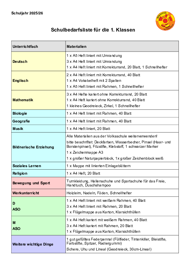 Schulbedarfsliste 1. Klassen MS Bad Radkersburg