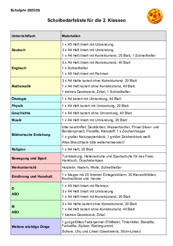 Schulbedarfsliste 2. Klassen MS Bad Radkersburg