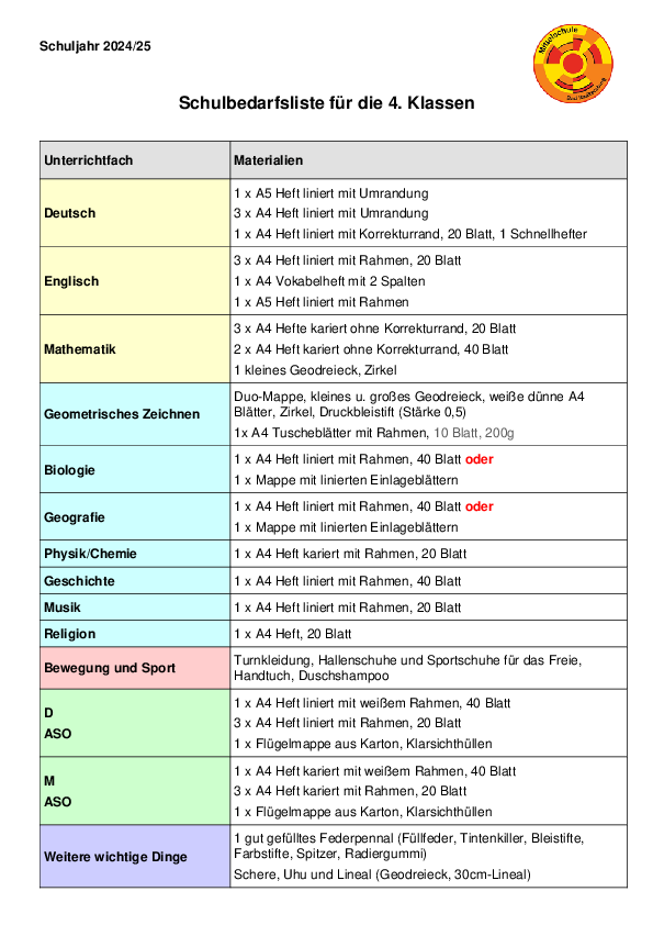 Schulbedarfsliste 4. Klassen MS Bad Radkersburg