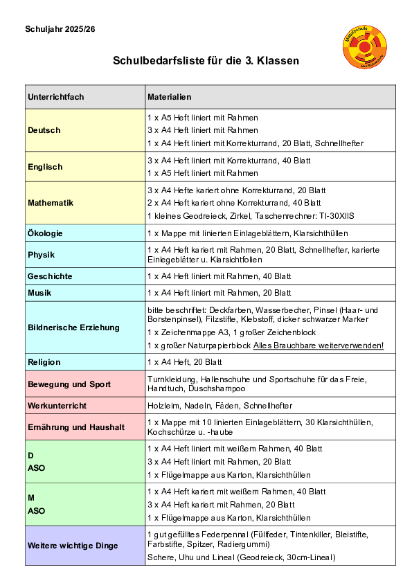Schulbedarfsliste 3. Klassen MS Bad Radkersburg